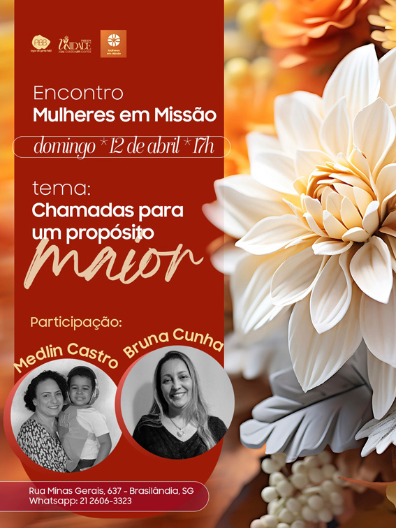 O nosso Ministério Mulheres em Missão convida todas as mulheres para mais um encontro cheio da presença de Deus, onde seremos edificadas, encorajadas e lembradas de que fomos chamadas para algo maior do que imaginamos.