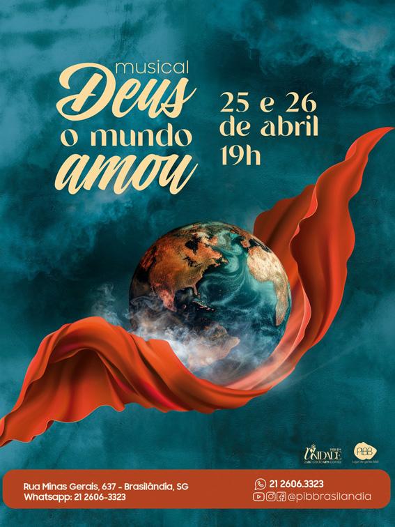 Nos dias 25 e 26 de abril, nossa igreja apresentará o musical “Deus o Mundo Amou”, uma mensagem cantada e encenada que nos conduz ao verdadeiro significado da Páscoa: o amor de Deus pela humanidade.